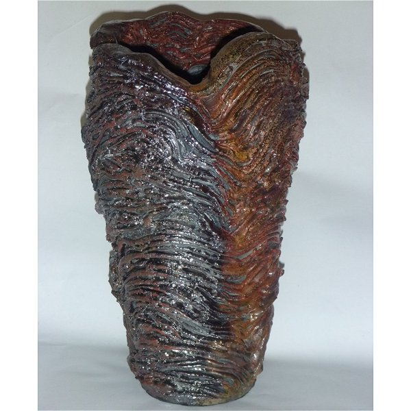 "Layered" - as the pieces are made up of many individual layers, that come together to form the whole. Each piece echoes the ebb and flow of water, creating rhythm in the movement of the clay as well as using a glaze that starts flowing when it is fired to 1280 degrees. There are also some Raku pieces that were inspired by the afternoon reflections on the water.