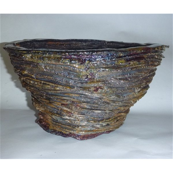 "Layered" - as the pieces are made up of many individual layers, that come together to form the whole. Each piece echoes the ebb and flow of water, creating rhythm in the movement of the clay as well as using a glaze that starts flowing when it is fired to 1280 degrees. There are also some Raku pieces that were inspired by the afternoon reflections on the water.